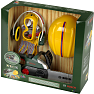 Bosch-design motorsavssættet består af en motorsav med savelyde og et blinkende lys, når den er i brug, et par højkvalitets handsker i én størrelse, et par sikkerhedsbriller med elastikrem, et par justerbare høreværn i standardstørrelse og en justerbar hjelm til unge håndværkere. Beskyttelsestøjet er designet til leg og har ingen beskyttende funktion.