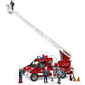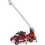 Brandbil med udtrækkelig drejeskivestige, funktionel vandsprøjte, vandtank, udtrækkelige støtteben og diverse værktøjsholdere.
