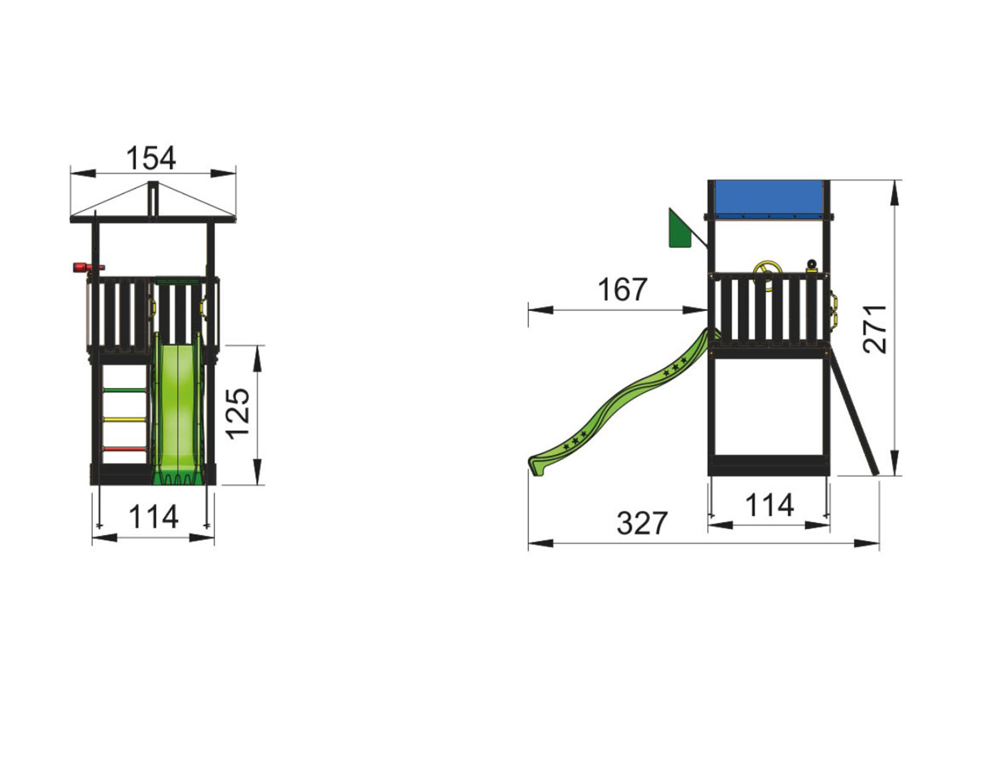 Legetårnet består af fyrretræ der er grundmalet i sort farve som passer godt til en hver have. Testet og overvåget for kvalitet og sikkerhed (i henhold til EN: 71-1, 2, 3, 8 & 9) CE godkendt.